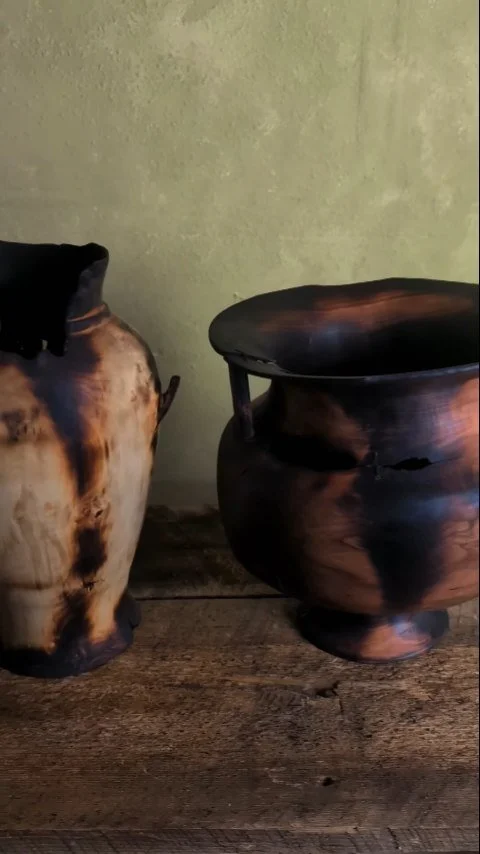 This collection of turned and carved vessels maintains historical roots to traditional forms while reimagining elements in a contemporary context. All are created from locally salvaged wood, aged with a combination of fire and red wine, and finished with varnish oil.